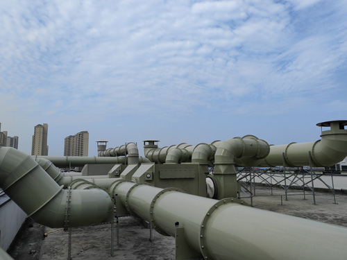實驗性室有機廢氣治理 → 靈活性炭纖維過濾裝置器 → 引軸流風機 → 廢氣排放